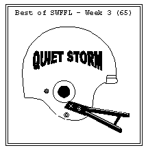 The Quiet Storm notched their first "W" of the year in resounding fashion. They grabbed the "Helmet" against the defending champion Black & Blue Attack. The Storm was led by Kurt Warner (they do score a lot of points in Arena football don't they) and a career day by Todd Peterson. The Black & Blue still had J.J. Stokes on Monday night but he could not overcome the early lead of the Storm. In another contest with potential "Monday Night Madness", the Dream Team and a 19 pt. lead held off the Jelly Beans and Terell Owens. The Dream Team, though 2nd in points is the only team that has scored over 50 pts. every week. The Dream Team was led by the surprising Charlie Batch and the SEAHAWKS ST. The Beans loss can be traced to Brad Johnson's first disappointing outing of the year. The "Game of the Week" goes to the contest between the Bull Dogs and the Mac Attack. I usually don't like low-scoring affairs as GOW, but it could not be avoided this week. The Bull Dogs, Steve Young and Jerry Rice overcame a 5 pt. deficit to the Mac Attack. It was a good thing the Dogs got their score early as Young got knocked out in the first half and the Niner's pretty much went to the ground game after that. Hot Free-Agents (Pts. from Weeks 1-3) NEW: CHATTERBOX:(Get Quotes in by Monday Night)