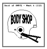 The Bull Dogs beat the undefeated Quiet Storm. The Storm was missing their number 1 pick, and their best QB so far this year. The Dogs took advantage getting nice scoring from various places. The CHIEFS led the Dogs for the 2nd straight week and are making a serious bid for 15th rounder of the year. I guess with the new defensive scoring system in place, everybody forgot to pick up the team with the best kick returnner in the league. The Body Shop's Double-Bubble finally clicked on all cylinders as Manning put up a 51 and Harrison put up a 36. Hambrick even put up a surprising 21 as the Shop trounced the Good Fellas. The Fellas still had Favre and Green on Monday, but an 83 point lead is pretty much golden (even against the Favre of old). I have to admit the Fellas put up a game effort. The M. Takers subbed the QB in their early Double-Bubble combo, but got some pretty good results too. Frerotte to Moss was good for 63 points. The Beans got zip form McNabb and were pretty much give last rights at 4:00. The "Game of the Week" honors go to the contest between Black & Blue and the Sharks. It was the closest contest of the week and involved the 2nd place team at the time. The Sharks got a 0 from Henry before the game started. The Sharks management was probably out doing something fun, instead of sitting in front of the TV, awaiting ever little word from Chris Mortenson. Bulger, Lewis and the TITANS built up a nice little lead for the Attack, who thought they were through with the number one pick out and Gannon forgetting how to score early this season, and T.O. in funk. Gannon remembered how to score in week 4 and he almost brought the Sharks all the way back for the "W". Now that the Sharks just have to get T.O. back on track. CHATTERBOX:(Get Quotes in by Monday Night)