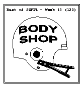 ![]() In Week 13, The Black & Blue Attack slipped a bit back to the rest of us and the biggest question in the league is who is hotter the Quiet Storm or the Body Shop. Week 14's lineup deadline is the Trade deadline!! In the Casey Survival Pool, there are only 4 people left and only Bone remains from the SWFFL. Good luck in the final week Bone!! The printed notes have some information than isn't on any of the web versions. If you do not have word, I can send PDF versions of the Notes or you can download wordviewer from Microsoft.com. The league's url is http://swffl.50megs.com . Key Matchups to watch this Week The Secane Tsunami will try to avenge their early season loss against the red-hot combo of the Body Shop, Romo and whoever that girl is in his logo. In a battle of Elite teams the Black & Blue Attack will try to complete the season sweep of the Dream Team. The Quiet Storm will try to avenge their early season loss to their Jelly Beans and try to keep pace with the rest of the Elite Teams. The Good Fellas will try to complete the season sweep of the Black Revenge and maybe climb out of the basement. The M. Takers will try to keep their Elite hopes alive by repeating their early season victory over the Jail Birds. Spock was 4/5 making him 30/55 (55%) on the year and he retains top billing. Norm (my estimates) was 3/5 making him 29/55 (53%) on the year and his lines (my estimates) appear below: BS -1 ST (195) GF -3 BR (197)DT -9 BB (209) JA -4 MT (198) QS -2 JB (196) Two games were decided on Sunday, one was more or less over and the other 2 were still up in the air. The Body Shop avenged their early season loss to the M. Takers by capturing their 2nd helmet in a row. The Shop has won 4 of the last 5 and they are on a roll. The only question is; did the Shop start the roll too late? The Shop was led by the BEARS, Mason and Bryant. Manning led the Takers in the losing effort. The Takers only had one coaching mistake, but Moss over Galloway would have given the Takers the "W". The Dream Team completed the season sweep of the Black Revenge. Tory Holt was the only starter from either team to clear the 20 point barrier as this game was not exactly a point fest. The Revenge left a lot of points on the bench, but none of the moves would be enough to change the outcome. The Dream Team is still in third place, hoping one or both of the top teams hit a quick losing streak. |