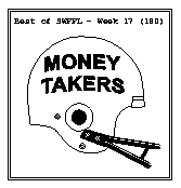 The Good Fellas avenged their early season loss to the Dream Team. The Fellas knocked their Dad and partner right out of the Elite, scoring more points than they had in the last couple of weeks. OK, I guess the youngsters finally got a little revenge for the whole Tim Dwight affair. The Fellas were led by Smith and Kennison. The Dream Team failed to field a starter who put up 20 points. Hey, at least we spent some hard earned cash for that Ron Dayne 0. The Jelly Beans avenged their early season loss to the Body Shop, wrapped up a Elite spot and shattered the Body Shop's Elite hopes. The Beans did this all with out benefit of any QB points, as Garcia got a Reid-rest too. Steven Jackson's 53 points made up for the lack of QB points for the Beans. The Shop had been the hottest team, but alas they were cooled by the Jackson Jett. The Shop wasted nice performances by Romo, Betts and Parker. The "Game of the Week" honors go to the contest between the Black & Blue Attack and the M. Takers. The Black & Blue needed a "W" and a whole lot of points or a Storm loss to capture the title. The Takers were all but pronounced "DOA" in last week's notes. They needed several key losses and almost a couple of hundred points to find their way into the Elite. One of these teams reached their goal. The Takers avenged their early season loss to the Attack, set the new one week record for scoring (which also gave them the consolation prize) and managed to sneak into the Elite anyway. The Takers new record of 180 points was due largely to Tiki Barber's 67 point game (also a new record). Manning, Moss and Galloway also pitched in with nice games. The Attack only had Young score over 20 as they failed in their quest for another trophy. By the way, when a team sets the scoring record, I had to give it Game of the Week. CHATTERBOX:(Get Quotes in by Monday Night)